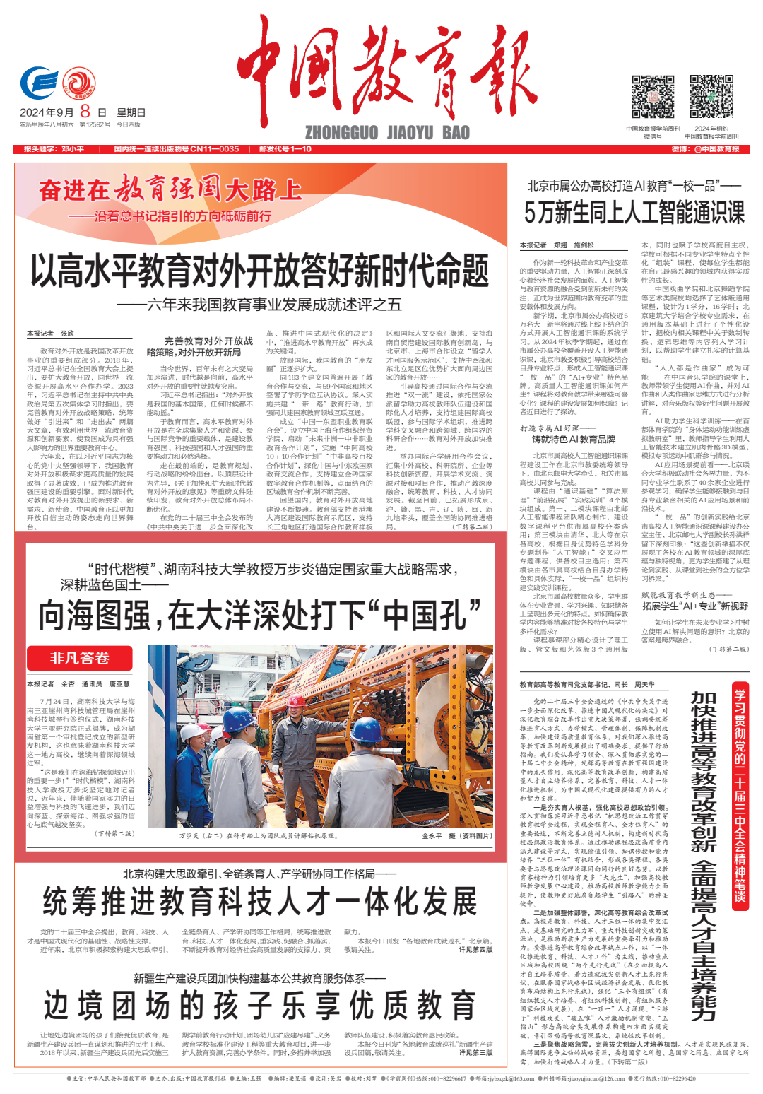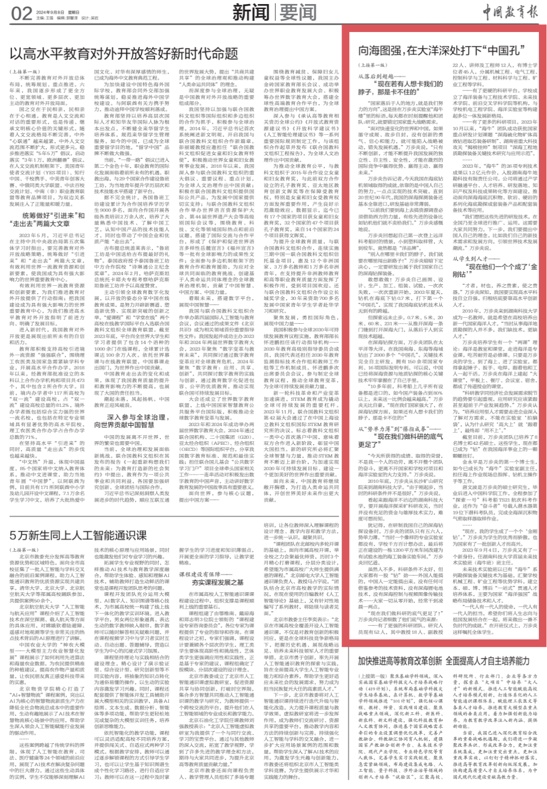 “这是我们在深海钻探领域迈出的重要一步!”“时代楷模”、湖南科技大学教授万步炎坚定地对记者说,近年来,伴随着国家实力的日益增强与科技的飞速进步,我们迈向深蓝、探索海洋、图强求强的信心与底气越发坚实。