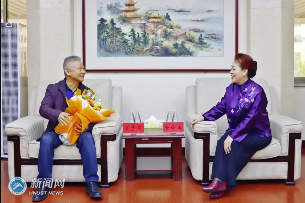 ▲人社厅党组书记、厅长唐白玉与万步炎亲切交谈